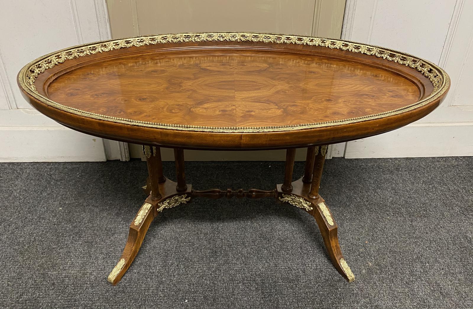 Possibly the finest Coffee Table we have ever owned, French in origin and dating to the 1920s. Made from Solid Walnut with a dished out top and sitting on a double base support each support with 3 columns and 3 legs. Perhaps the finest feature is the quality of the ormolu that adorns the table.