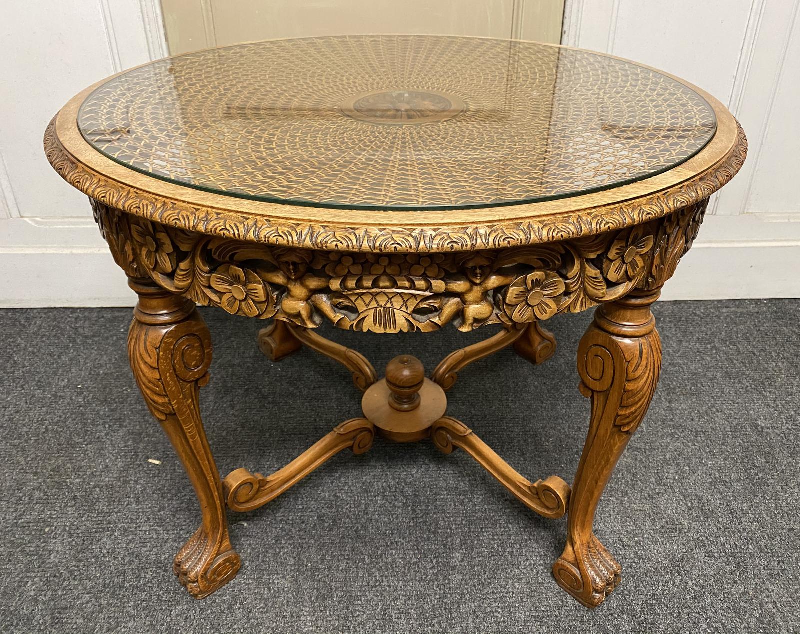 A lovely Coffee Table or Lamp Table made from solid Walnut and originating in Belgium. Nice carved freeze and the cane under the glass is perfect.