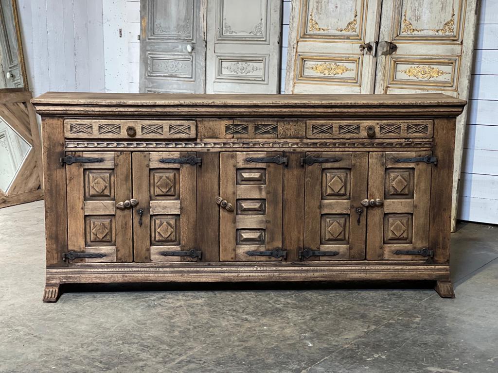 A lovely rustic style Spanish sideboard made from solid oak and having nice hand forged hardware. The 3 doors open to reveal a central shelf. Made from solid oak which have bleached to bring out the natural wood.