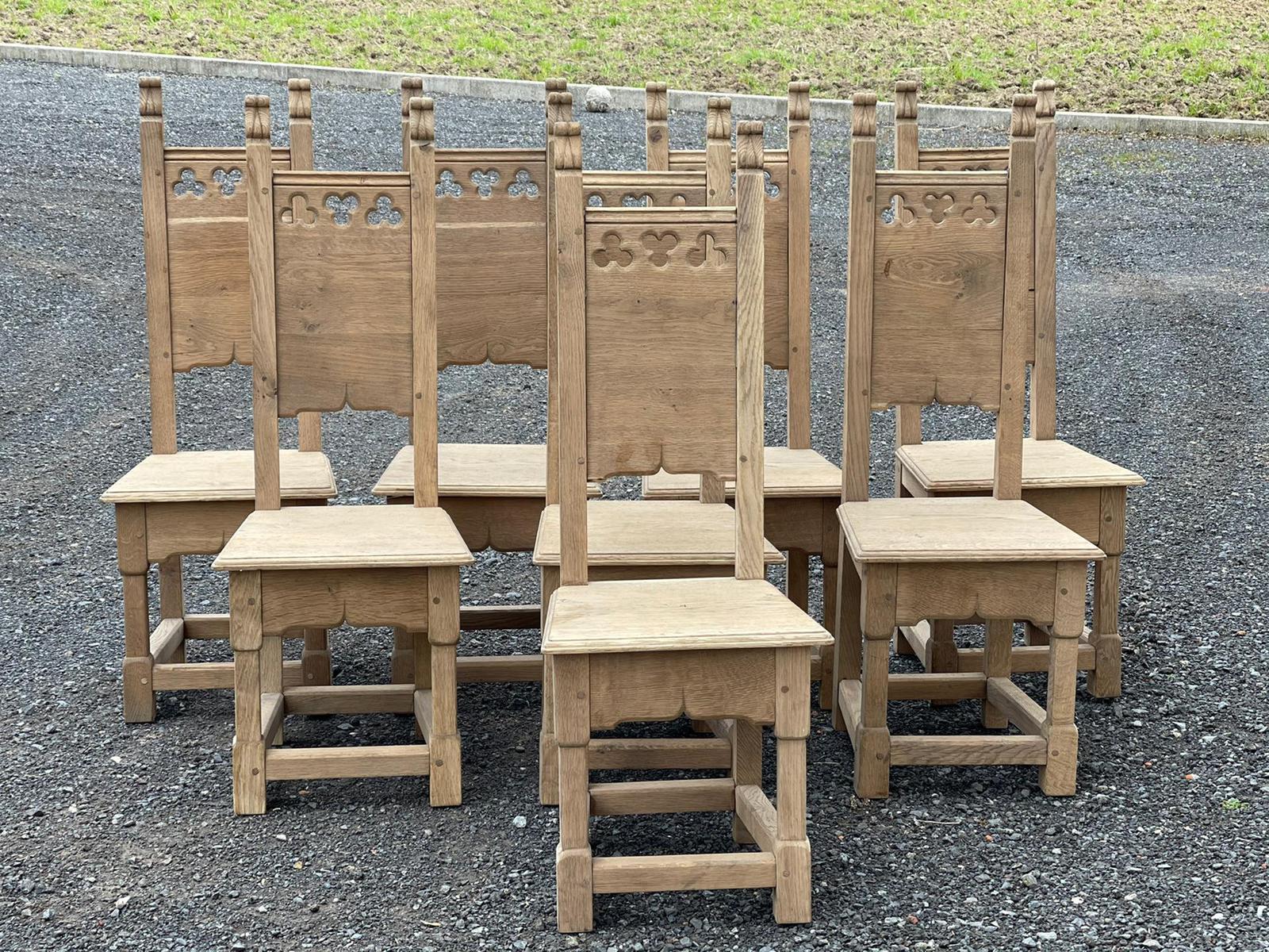 A hard to find set of 8 French Farmhouse Dining Chairs. Made from Oak which we have bleached. All strong and sturdy and in excellent original condition for the home.