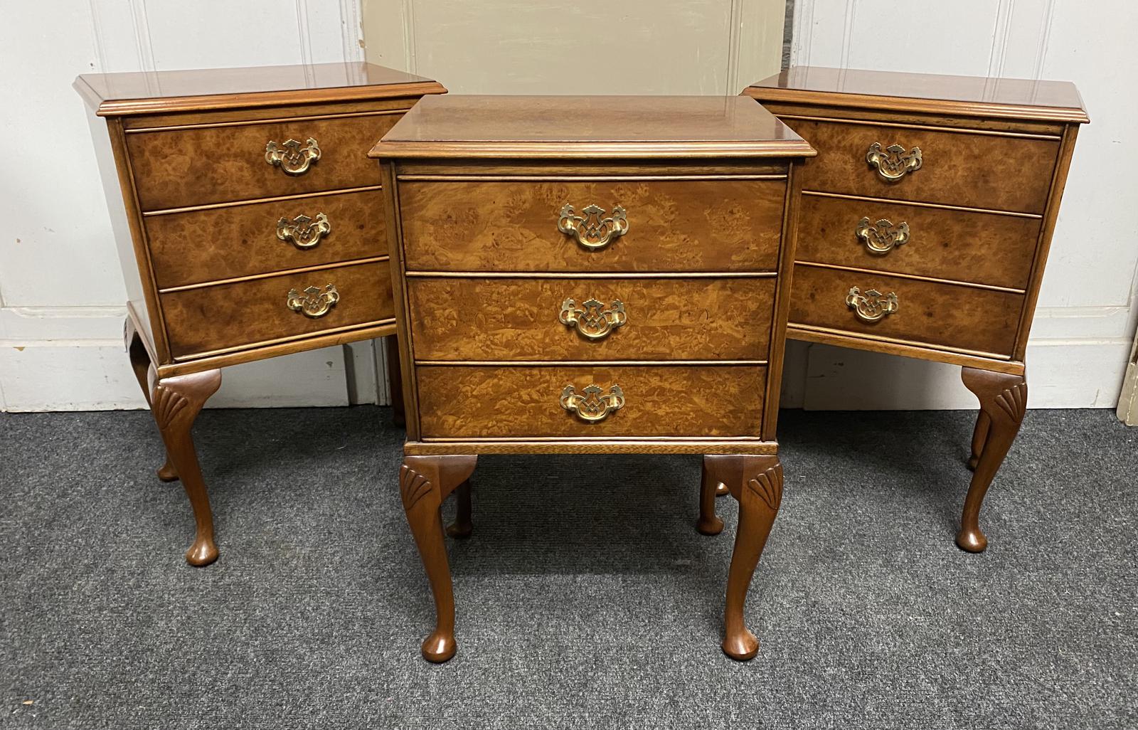 A nice set of 3 Bedside Drawers, granted 3 is an odd number but you may have use for a single. Made from Walnut with Burr Walnut to the fronts and tops. The tops are cross banded, all the drawers run smoothly fitted with original brass handles and they sit on Queen Anne legs.