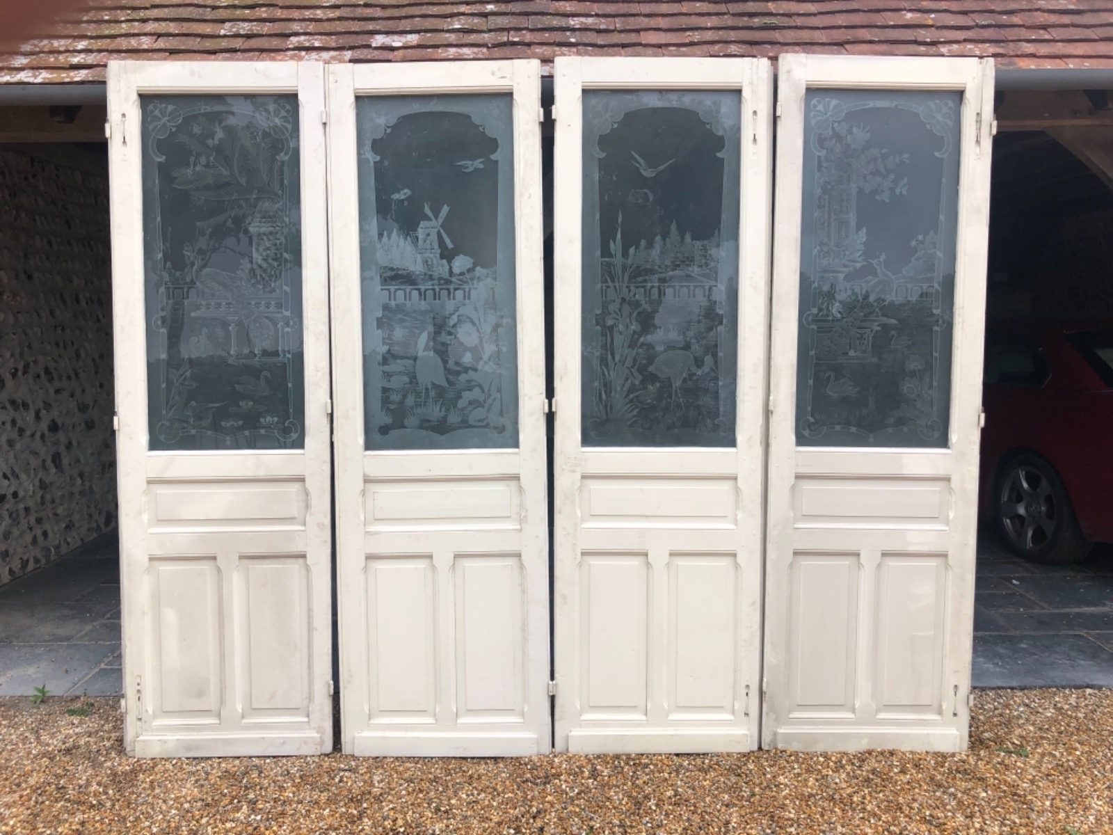 These are a lovely set of 4 French 19th Century antique doors having delightful scenic etched glass panels which are perfect.