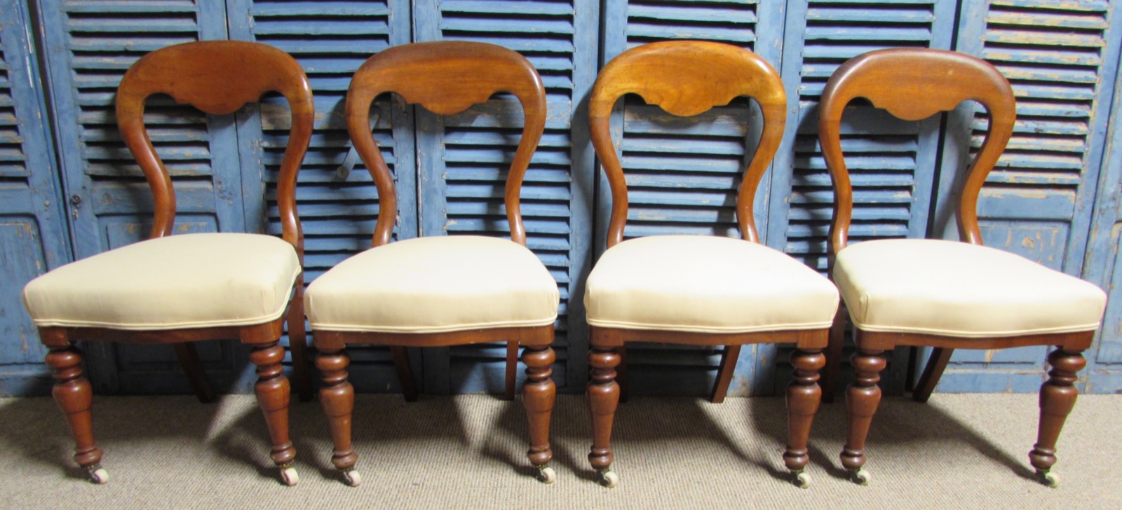 A very good quality set of 4 dining chairs, made from mahogany and dating to the mid Victorian era. The upholstery is not in to bad condition, certainly usable. The legs are turned with lovely brass casters.