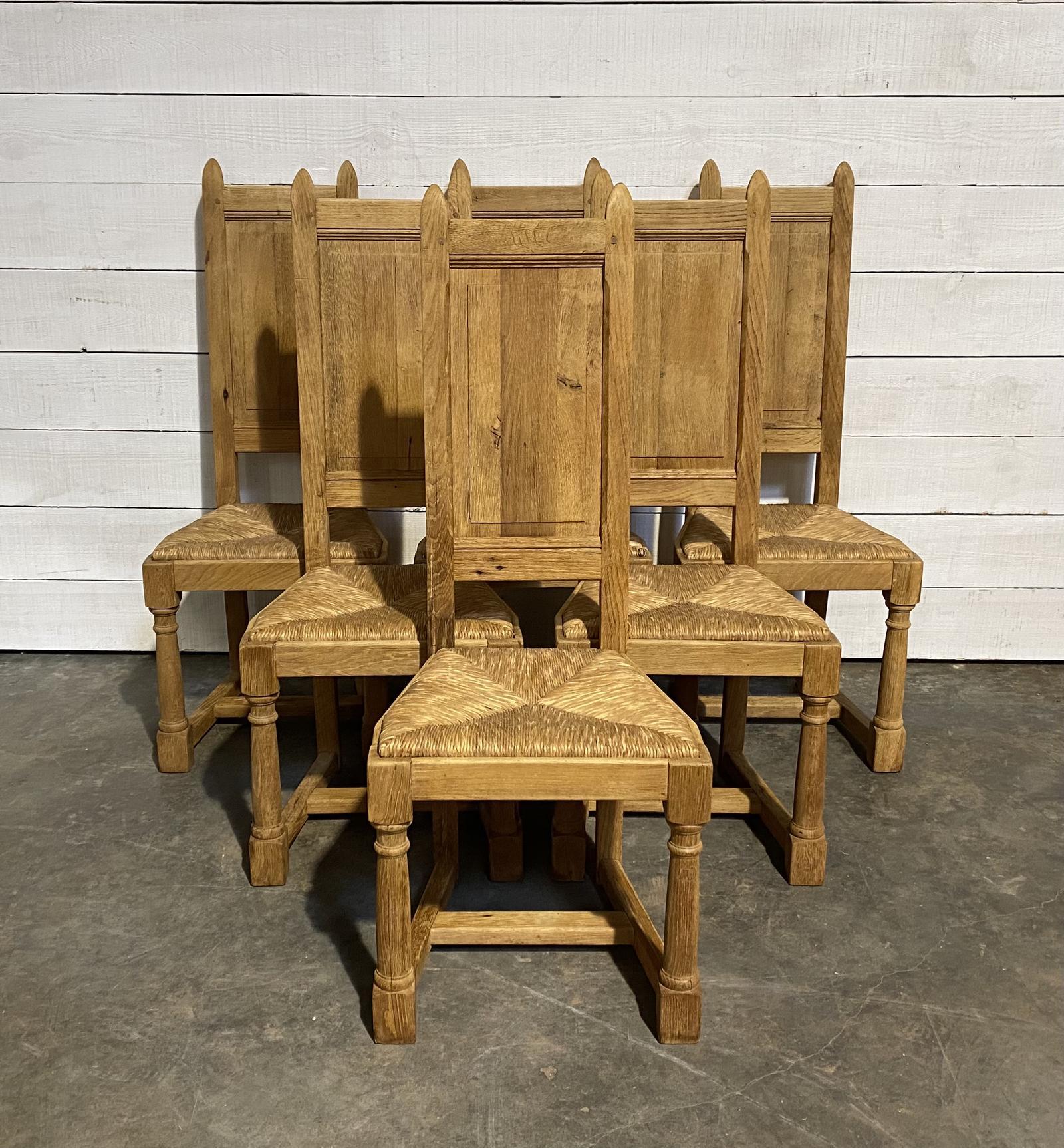 Lovely set of earlyt 20th Century French antique bleached oak farmhouse dining chairs. All six are strong and sturdy, all the rush seats are perfect and they are all in excellent overall condition. We have bleached them for a lighter look and ideal to go round a Farmhouse.