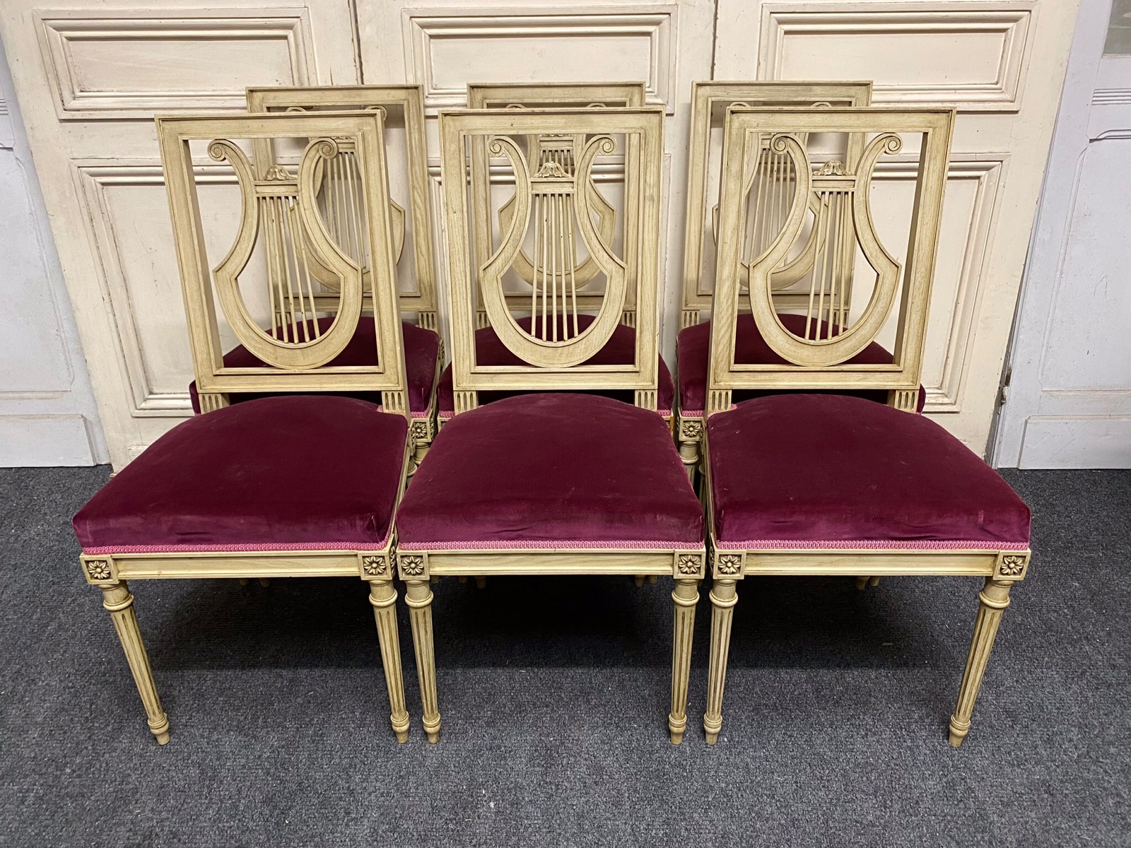 A lovely set of 6 French dining chairs, the harp back is particularly nice, they have their original finish and are very comfortable. The frames are strong and sturdy and the upholstery is in excellent condition with sprung seats.