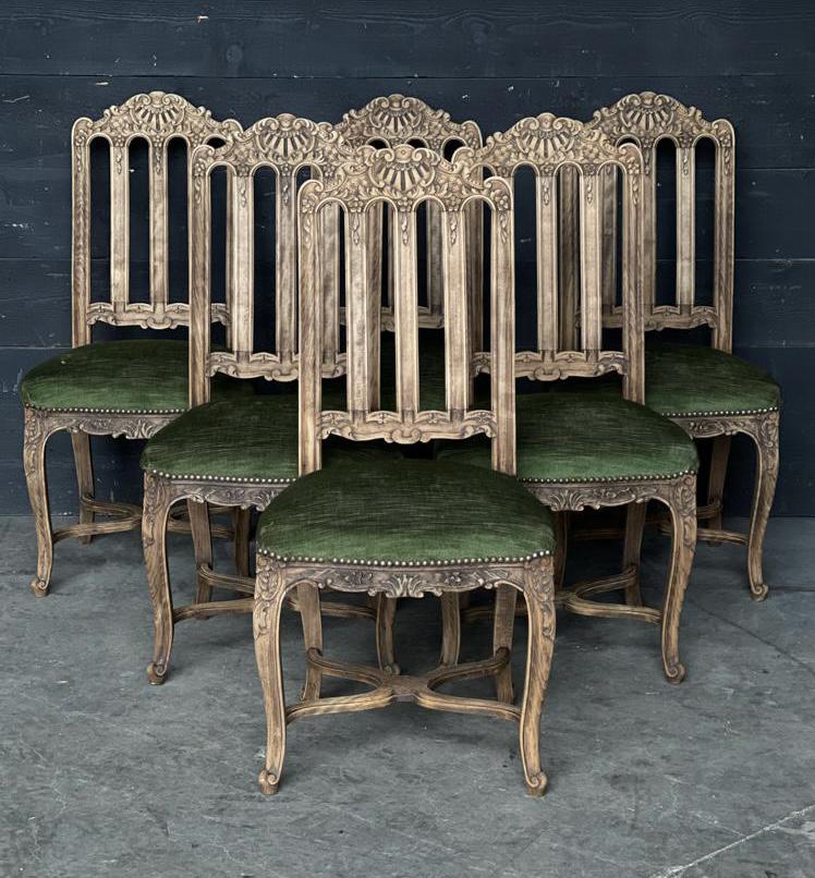 A lovely set of 6 French Farmhouse style dining chairs, made from solid oak around 1900, which we have bleached, all the chairs are strong and sturdy, nice carved detailing.