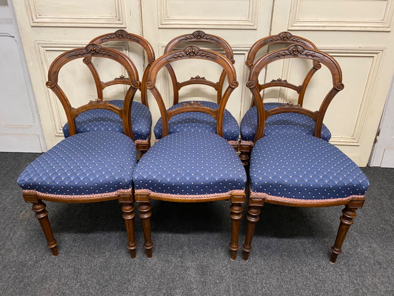 A set of 6 solid Walnut Dining Chairs, dating to the late Victorian period. The upholstery is perfectly usable and in good condition. Nice carved detailing and on fluted legs.