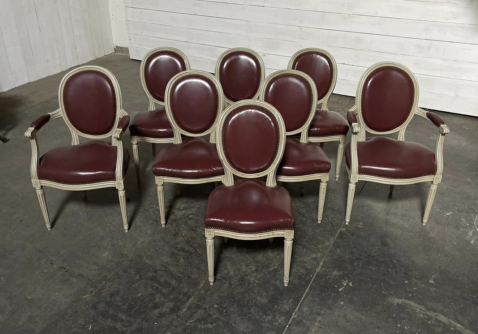 A lovely set of 8 French Dining Chairs, having original off white finish and original leather upholstery which is in very good condition, of course you may want to take it off and re upholster in a fabric of your choice. The sprung internal seats are in excellent condition and comfortable. All the chairs are strong and sturdy.