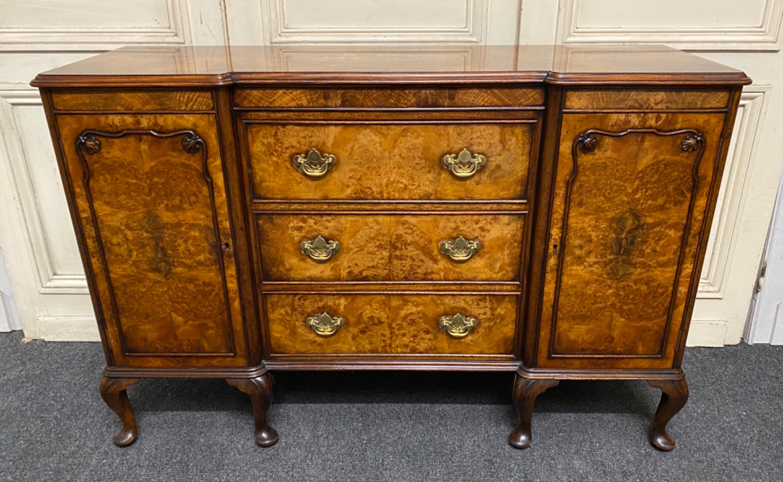 A lovely smaller sized Burr Walnut Sideboard. This is an excellent quality piece dating to the 1920s. Having 3 central drawers flanked by 2 lockable cupboards (key present).