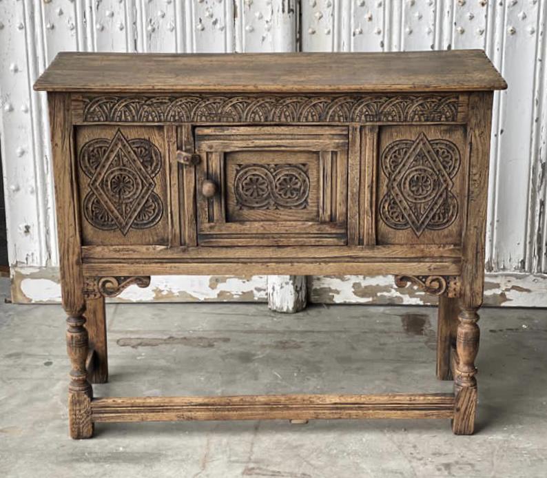 A useful smaller sized cupboard or sideboard, idea for a hall. Made in the 1900’s and of good quality construction, nice carved details with single door. In excellent original condition for the home.