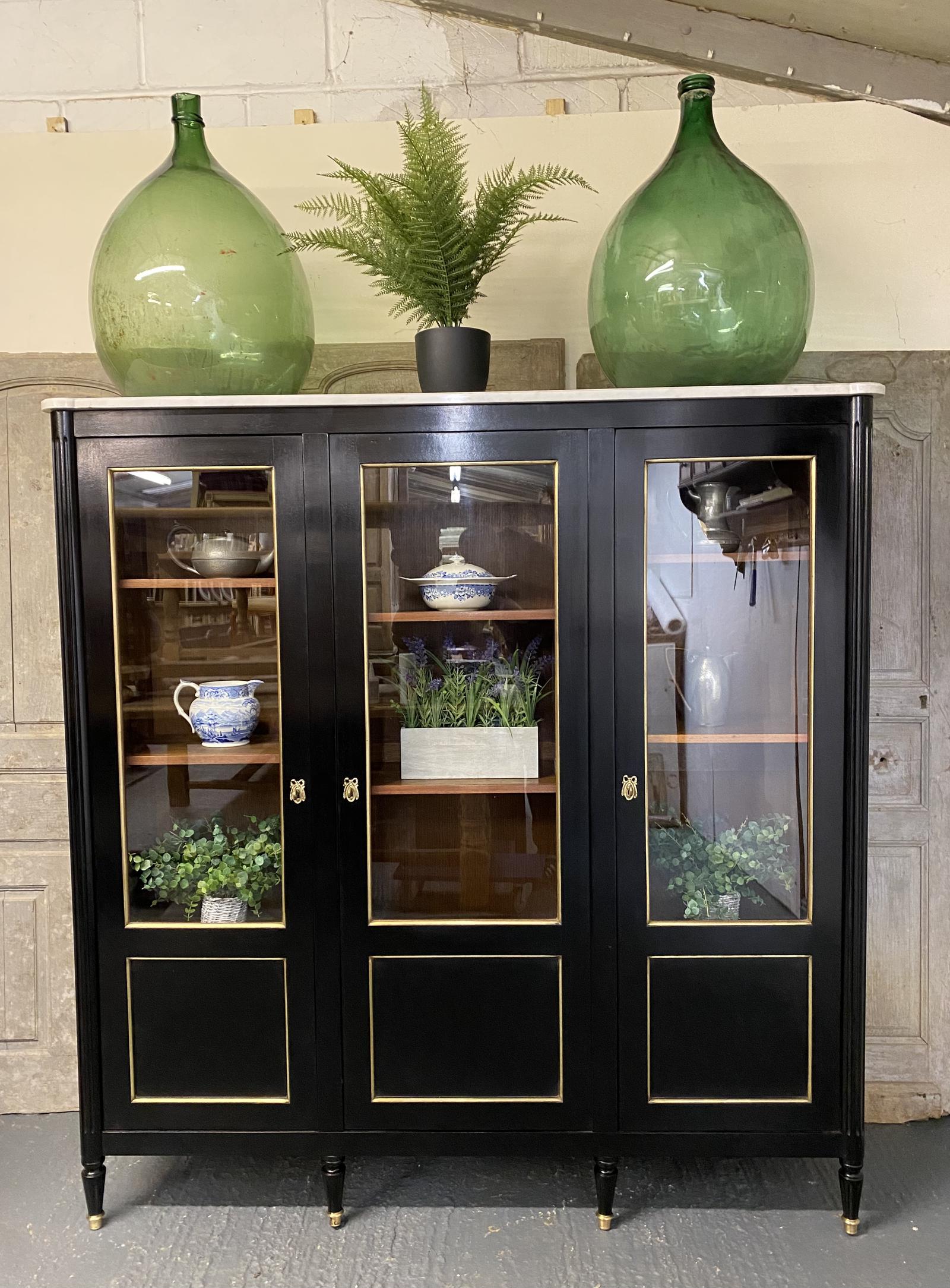 This is a delightful French Louis XVI ebonised vitrine or bookcase. dating to the early 1900s and of excellent quality. The 3 lockable doors (3 keys present) open to reveal 3 adjustable shelves in each section. Nice brass around the panels, original white marble top and brass capped feet.