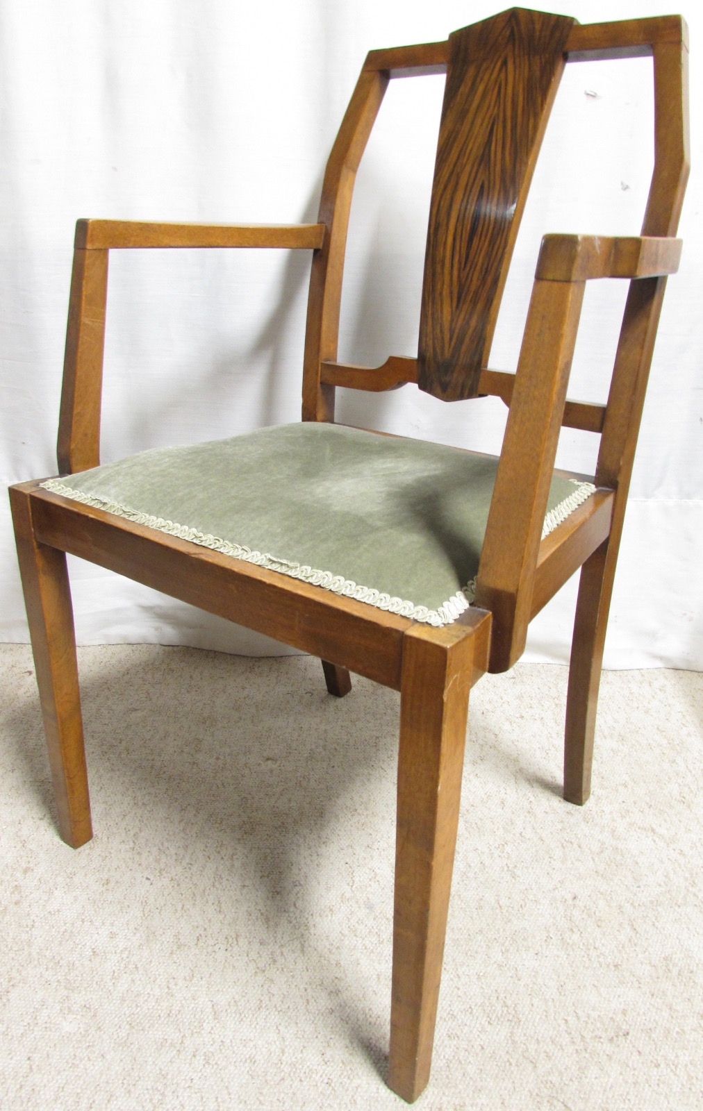 This is a very stylish Art deco chair made from solid walnut with a Zebrawood back spat. The chair is solid and sturdy. Would make an ideal desk or dressing table chair.
