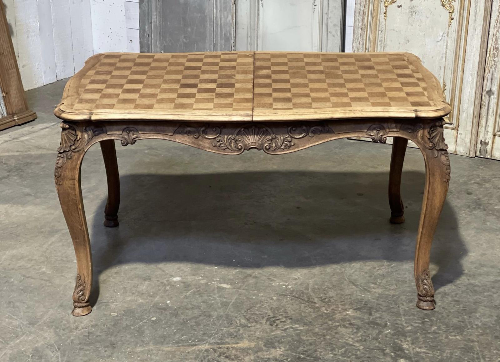 This is a lovely oak French dining table, having a parquetry top and lovely carved decoration around the base. It does extend out and would take 2 extra leaves but we don’t have, you could have pine ones made for occasional use if desired. We have bleached this to bring out the natural wood.