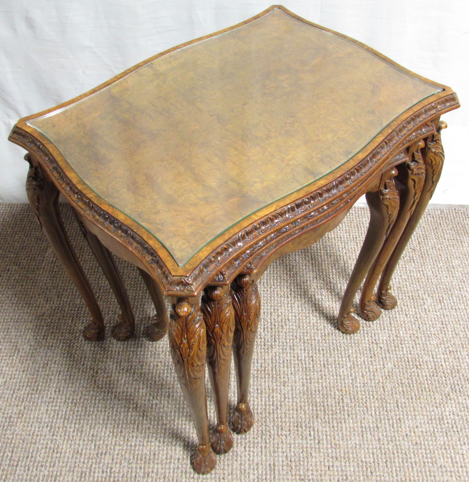 A superb quality Nest of 3 Tables, ideal Coffee or Occasional Tables that are made from solid walnut with excellent tight Burr Walnut. Each Table has a glass top and they sit on Queen Anne legs. The carved detail is crisp and well executed. These are the finest quality from the period, the rolls Royce you might say.