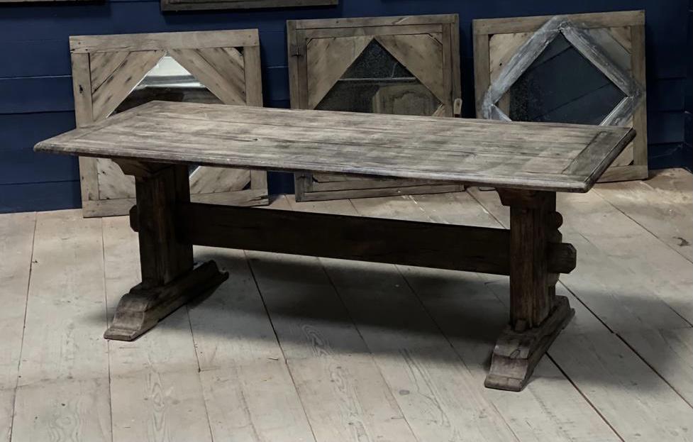 A great looking Farmhouse Refectory Trestle End Farmhouse Dining Table. Made in France from solid Oak and dating to the early 1900s. Loads of character and rustic charm. Comes apart for easy access into the home.
