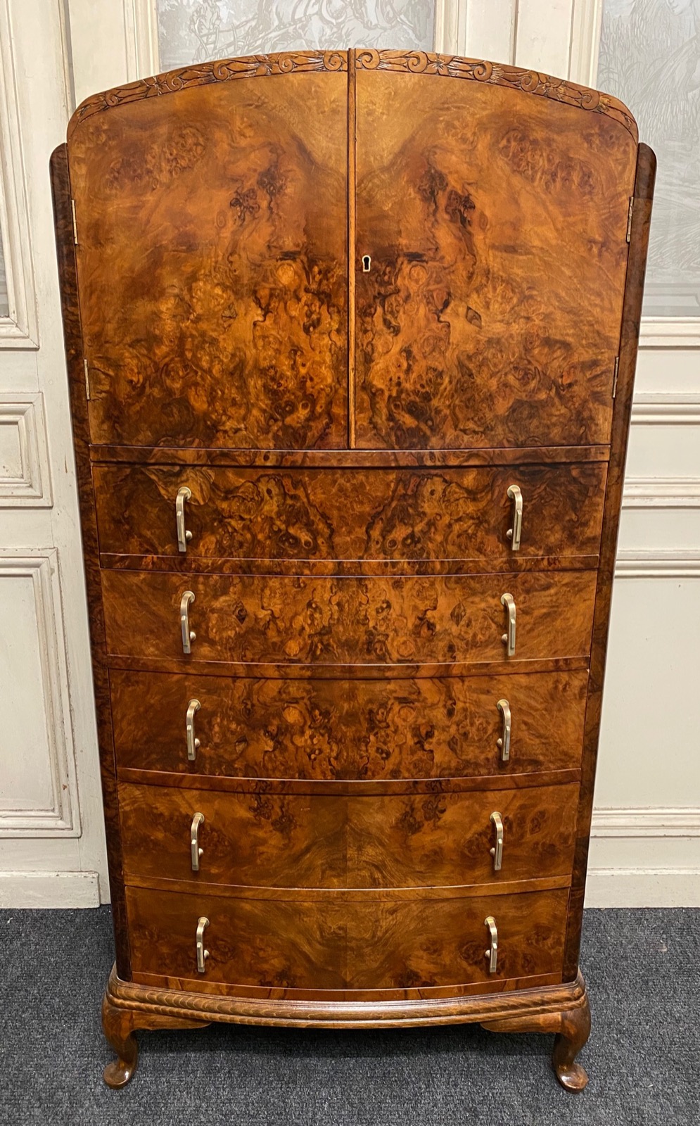 A truly wonderful high Art Deco design piece of furniture, made from walnut with excellent tight burr walnut. The best quality from the era being very well made with excellent dovetails to the drawers, even the top is veneered in burr walnut. All the drawers run smoothly and fitted with original Art Deco handles. She is bow fronted in form and has round front edge sides.