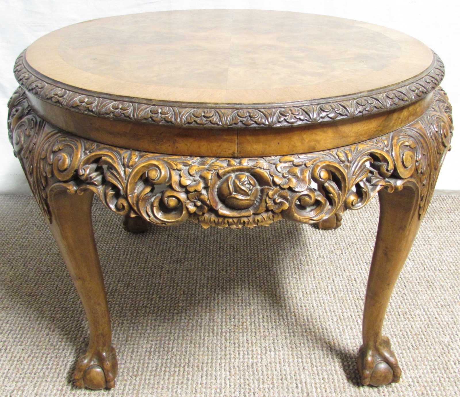 This is a superb quality Coffee Table made from solid Walnut with nice Burrs and the top is cross banded. The profusely carved border is crisp and extremely well executed. She sits on Queen Anne legs terminating in ball and claw feet.