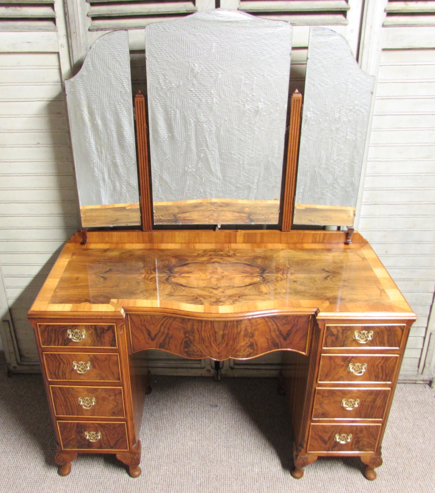 A truly wonderful Dressing Table, made from Walnut with Burr Walnut to the top and front. The 3 bevelled mirrors all move independently, the central one has a ratchet to adjust the rake and the outer 2 mirrors both back and forth. The 9 drawers all run smoothly and fitted with original brass handles. The top is cross banded and she sits on little Queen Anne feet.
