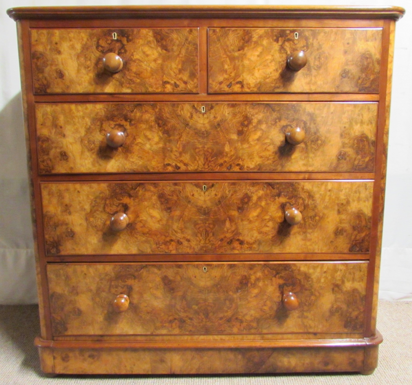 A very fine Burr Walnut Antique Chest of Drawers dating to the mid Victorian era, Made from Walnut with excellent Burr Walnut. All the drawers are fitted with original handles and run smoothly. This Chest really is the best Victorian quality.