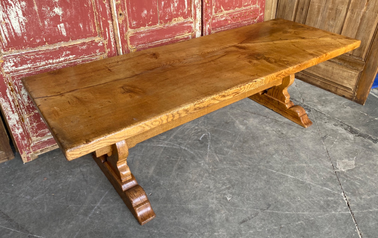 We are pleased to offer this very fine farmhouse dining table, French in origin and dating to the 19th Century. Made from solid oak with a thick top of a single plank, this is incredibly rare and a feature of an good table. Perhaps the best feature is the wonderful colour and patina built up over years of waxing, at 2.4m long.