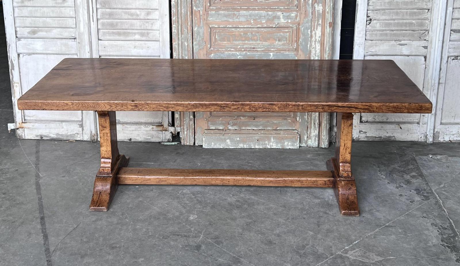 We are very pleased to offer this beautiful farmhouse dining table. Tables like this don’t come along very often, having such a wonderful original colour and patina. Its a good size also and very well constructed with a super thick solid oak top. The depth is good and a good end overhang.