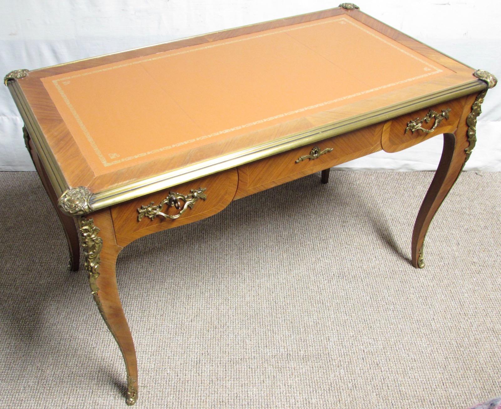 This is a superb quality French Bureau Plat or Writing Table as we would say. This is a top quality table, made from kingwood and having 3 drawer to the front which all run smoothly and are oak lined. The ormolu mounts which adorn this piece are the best quality, crisp and bright. The top fitted with a beige leather.