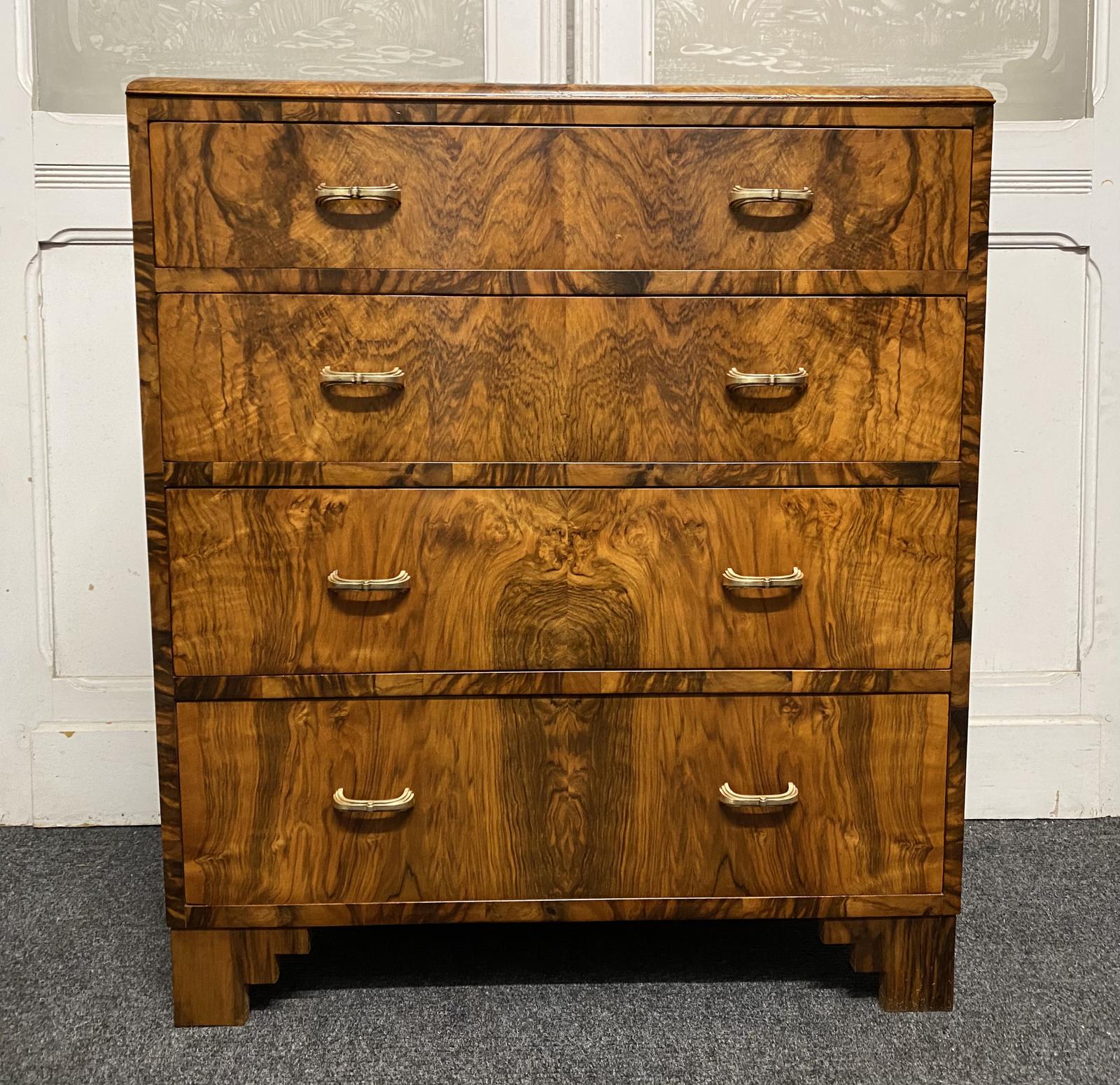 A superb quality art deco Chest of Drawers, made from Walnut with excellent burr walnut to the top and fronts. The drawers all run smoothly fitted with original art deco handles. Label in drawer ‘handmade by british craftsmen’.