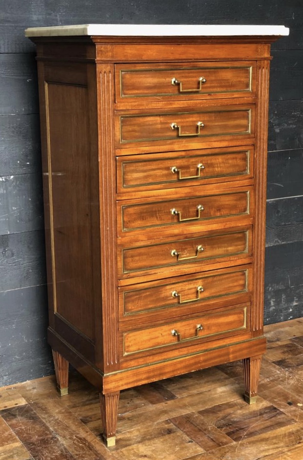 A very high quality Wellington chest of drawers, French in origin and made from Mahogany with solid Oak drawer linings.The original marble top is perfect. All the drawers run smoothly and fitted with original handles. She sits on square tapering legs with Brass cup feet. There is a makers name but too faint to read.