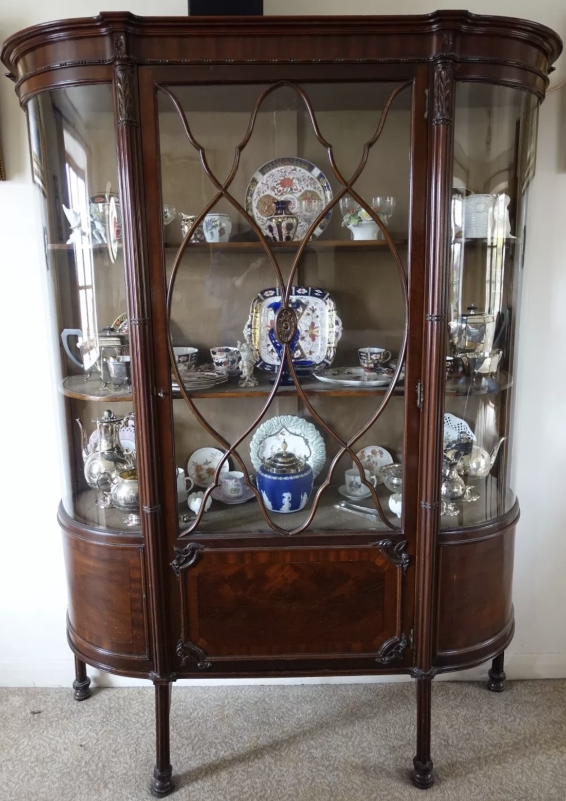 This is a very fine quality china or display cabinet probably retailed by Maple & Co. It was made from cuban mahogany with Chippendale influences. The central door open (key present) to reveal 3 shelves. The door has exquisite astragals and a flame mahogany panel, the legs and columns are reeded with acanthus tops.