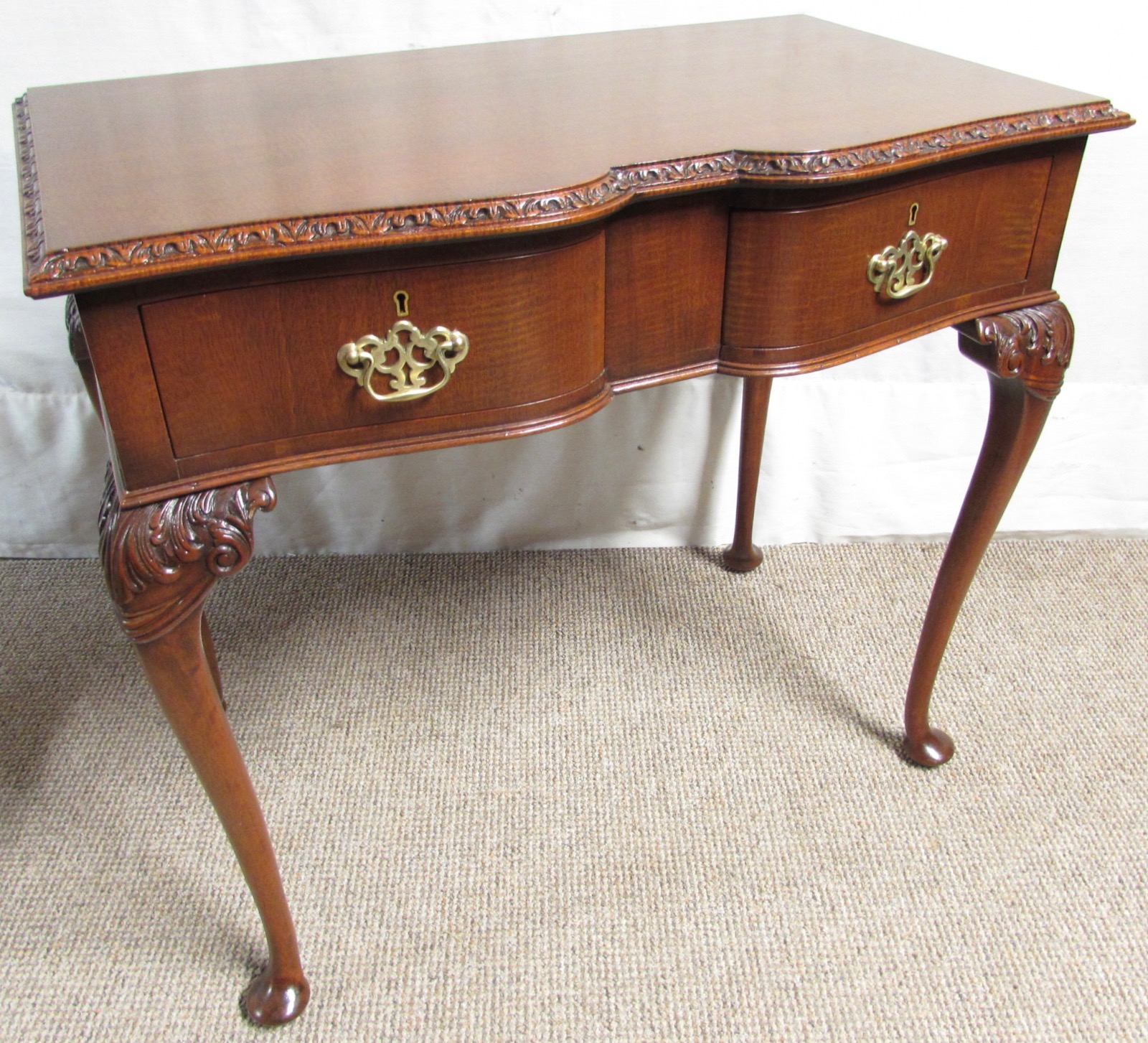 A delightful and very fine quality Walnut Side or Lamp Table, having a single drawer to the front fitted with original Brass handles. The front is shaped serpentine in form, the carving is crisp and well executed. She stands on Queen Anne legs.