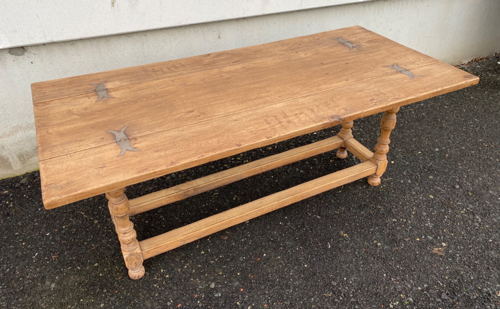 A wonderful and must be very rare, French 19th Century Farmhouse Dining Table, having 2 fold over flaps so the table can double in size width ways, very useful in a kitchen maybe. Made from solid oak and we have bleached it for the modern feel but it can be easily waxed to any colour or shade. The hinges of the flaps are a nice feature in themselves and there are 4 lopers that pull out to support the flaps.
