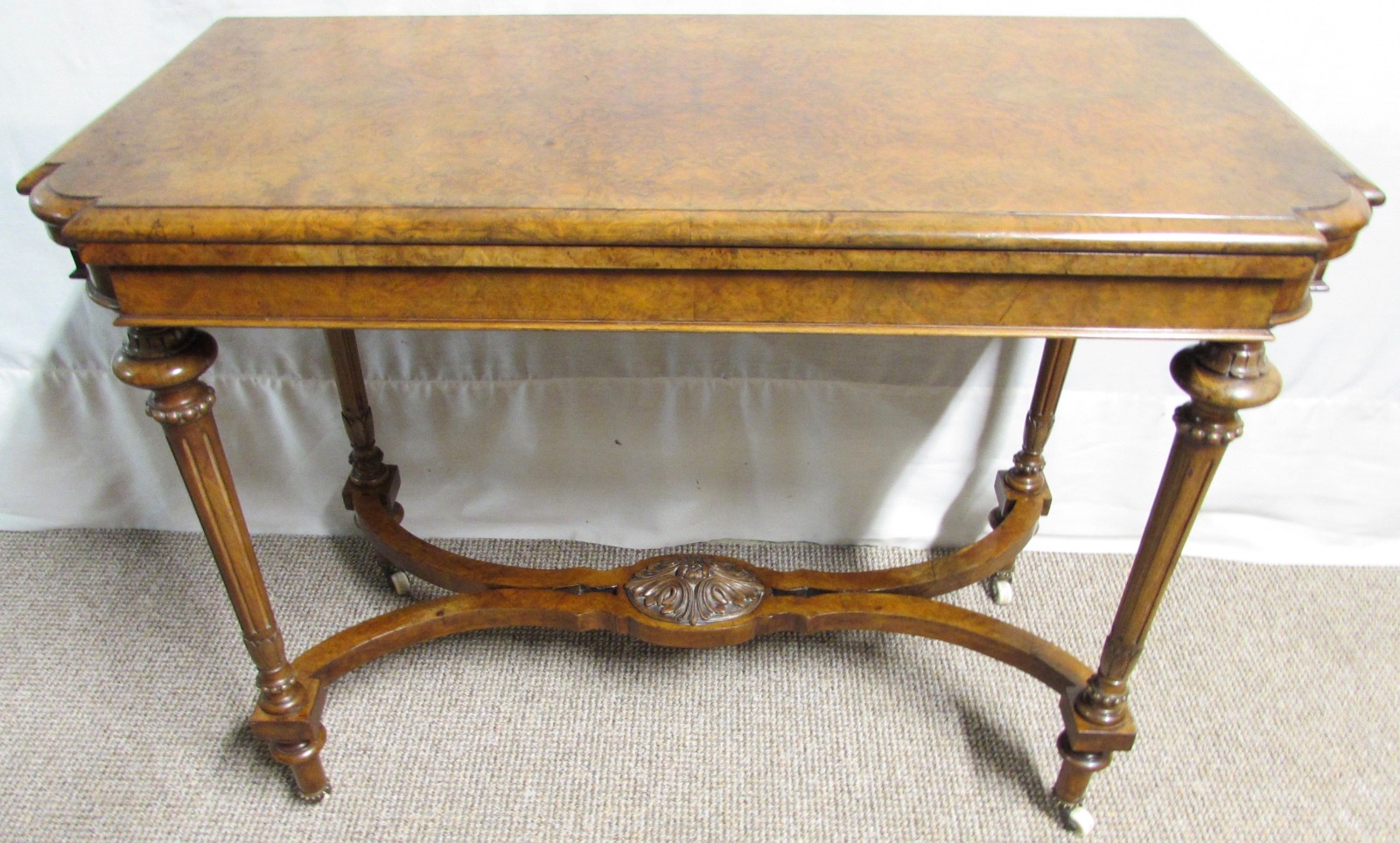 This is a superb quality Victorian card table, made from solid walnut with excellent tight Burr Walnut veneers. The shaped top flips over and turns round to be supported on the base, the original red baize is in good used condition. It sits on 4 fluted legs joined by a stretcher and having lovely original porcelain casters.