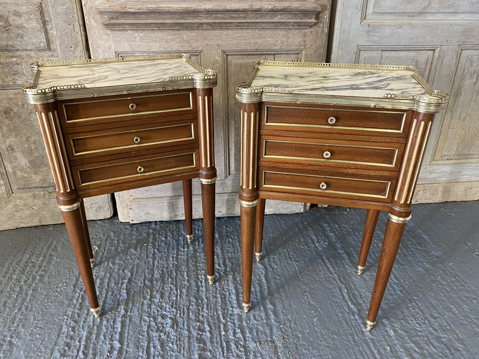 A lovely pair of French Louis Xvi Bedside Tables or Chests. Made from Mahogany with lovely brass galleries, mounts and feet, also brass strips around the drawers. The original inset marble tops are in excellent condition. The 3 drawers run smoothly fitted with original brass handles.