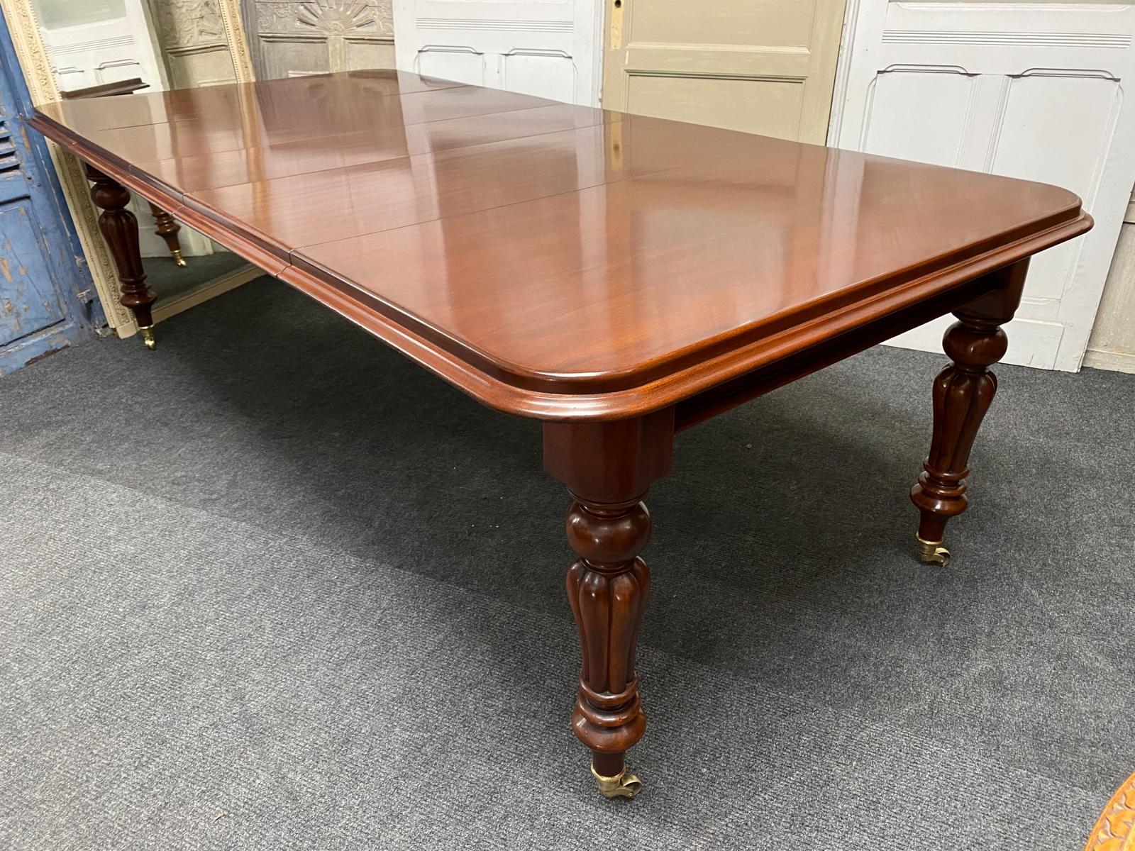 A good quality early Victorian extending dining table having 3 original leaves. Nice fluted legs with original brass casters. Can be used with nine, one, two or three leaves inserted and has brass locking wheels to hold the leaves in place. This is a nice example of an early pull-out table.