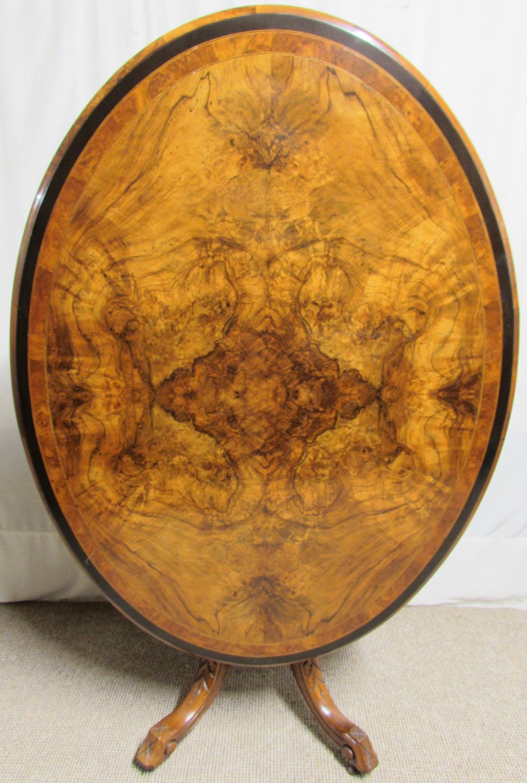 This is a nice 19th Century Victorian antique dining or breakfast table commonly called loo tables. The oval top tilts up so can be pushed to the side of a room. The top covered in excellent burr walnut and cross banded both with walnut and ammonia. The base is made from solid walnut.