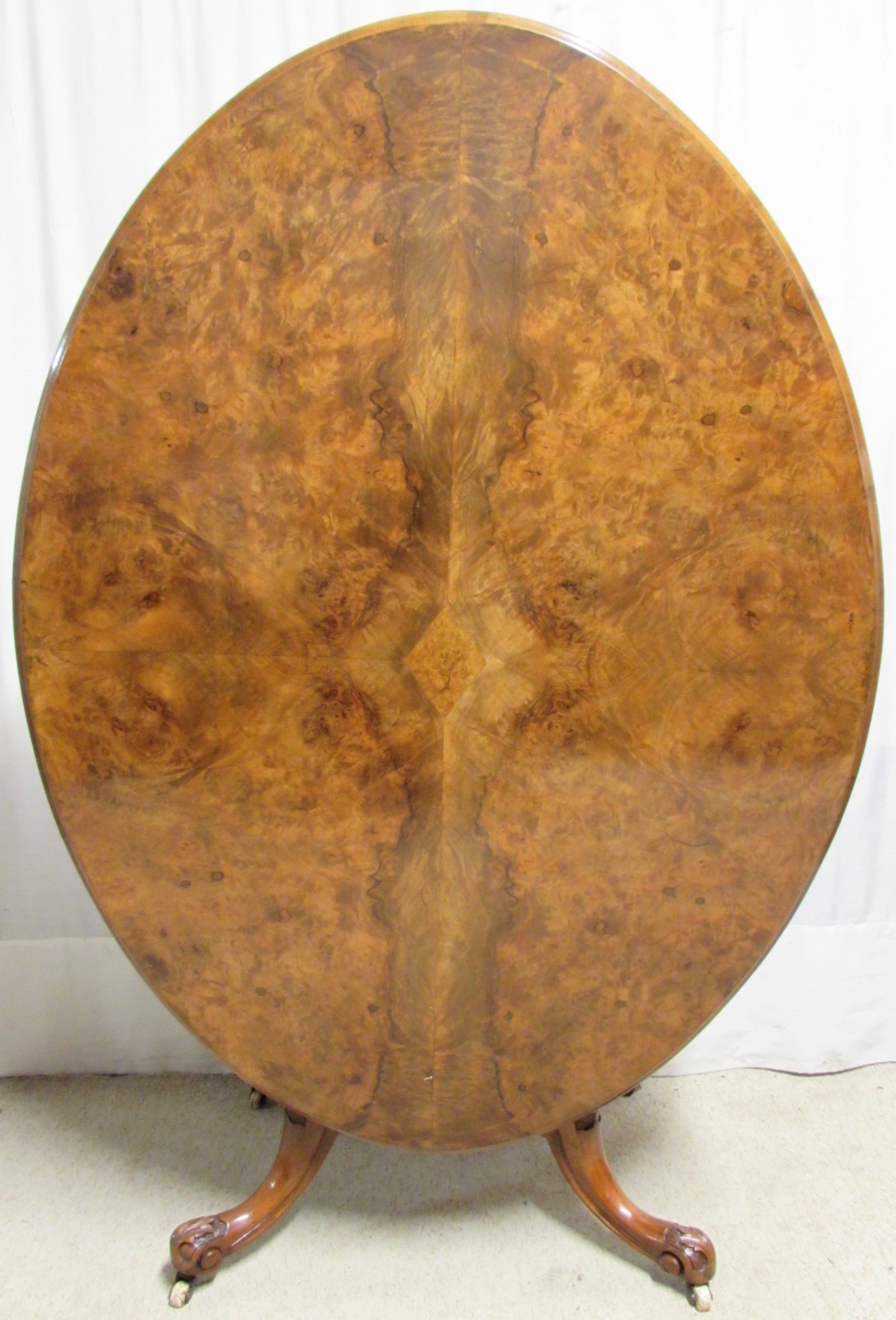This is a lovely oval 19th Century Victorian antique dining or loo table made from solid walnut with excellent burr walnut veneer. It sits on a crisply carved quadruple base with original casters. The top tilts up so can be moved to the side of a room.