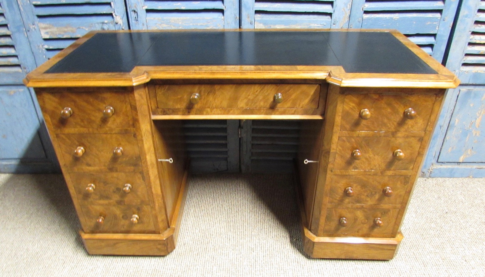 A delightful burr walnut desk, having 2 lockable (keys present) cupboards to either side and a central drawer. All the knob handles are original. There is a new leather writing surface to the top. Lovely burr walnut adorns this piece, it is finished at the back so can be free standing in a room.