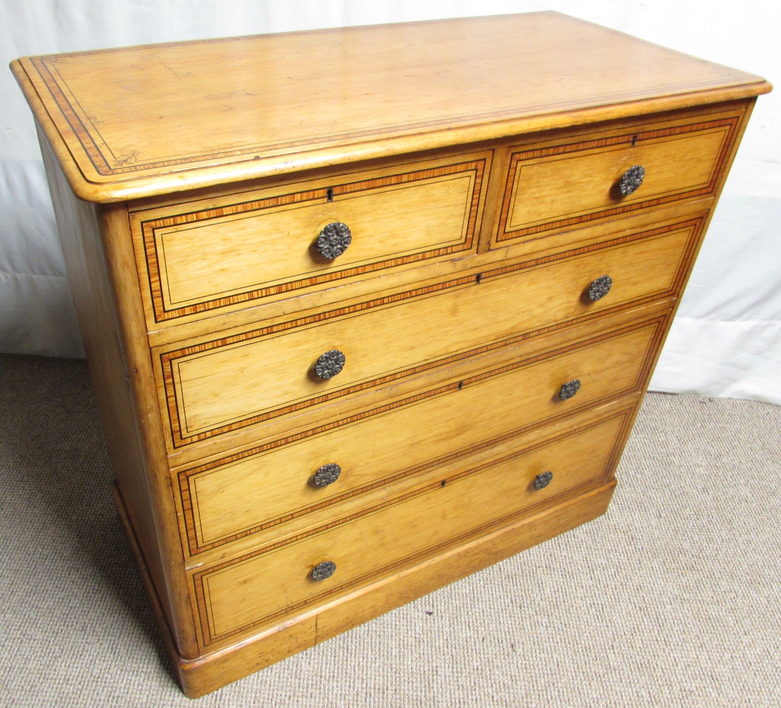 A highly decorative Chest of Drawers, made from dense pine and inlaid with tulip wood banding and decoration. This is a very good quality Chest not your usual pine. All the drawers run smoothly and provide plenty of storage.
