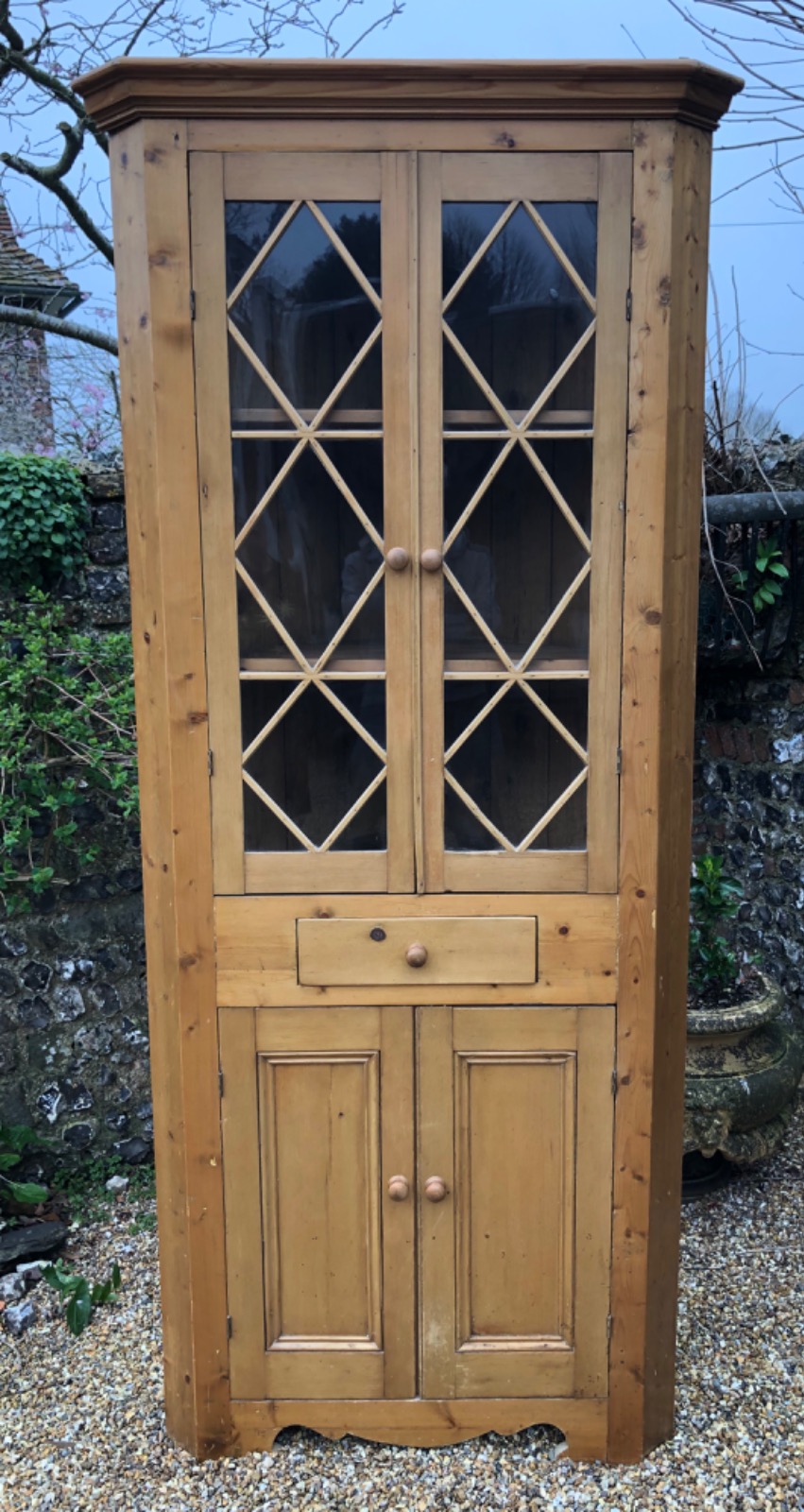 This is a lovely 19th Century antique pine corner cabinet dating to the late Victorian era. Having 4 doors and a drawer providing plenty of storage. Nice diamond astragals to the doors.