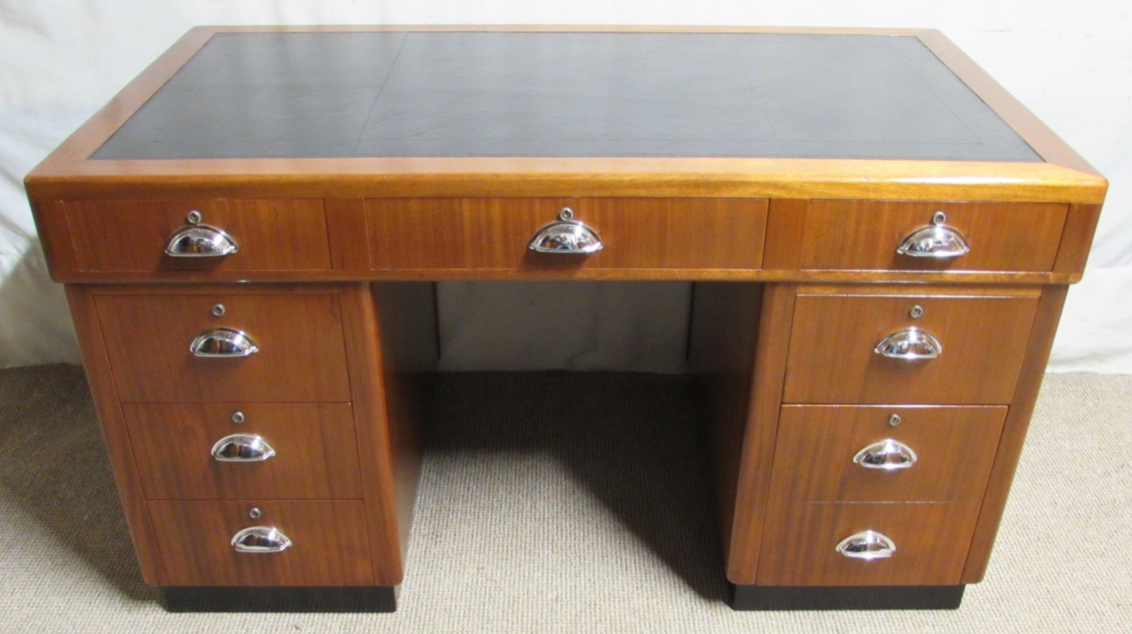 A very stylish and superb quality Art Deco Pedestal kneehole Desk. Made from Walnut and having a sumptuous new black leather to the top. All the drawers run smoothly fitted with chrome handles. The large bottom drawer is deep and split for files. The desk is finished right round so can be free standing in a room.