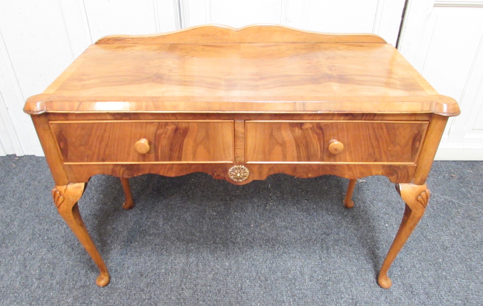An unusual low lamp table that would make an ideal TV stand made from walnut and having 2 drawers to the front. The table sits on Queen Anne legs.