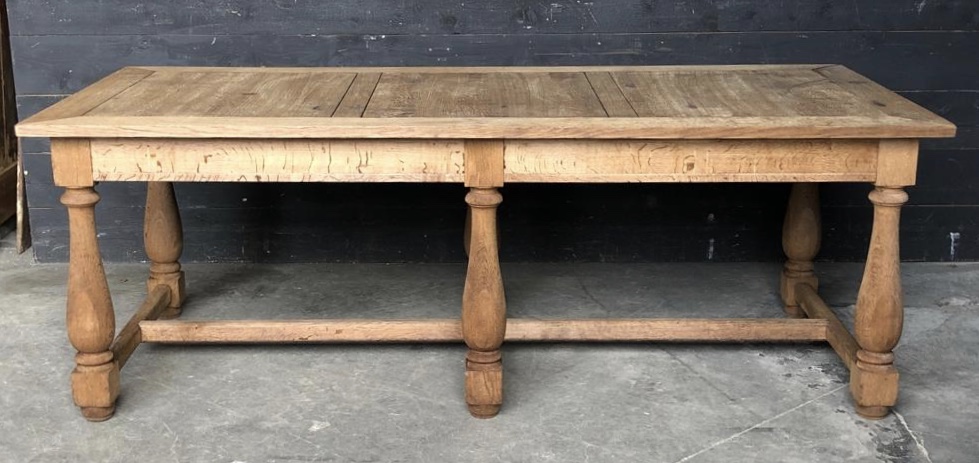 A really unusual French Farmhouse Table in that it has 6 baluster legs. Made from solid Oak and dating to the mid 19th Century. At 2.2m long will comfortably seat 12 people, also a good width at 1m. The knee clearance is fine at 63.5 cm.