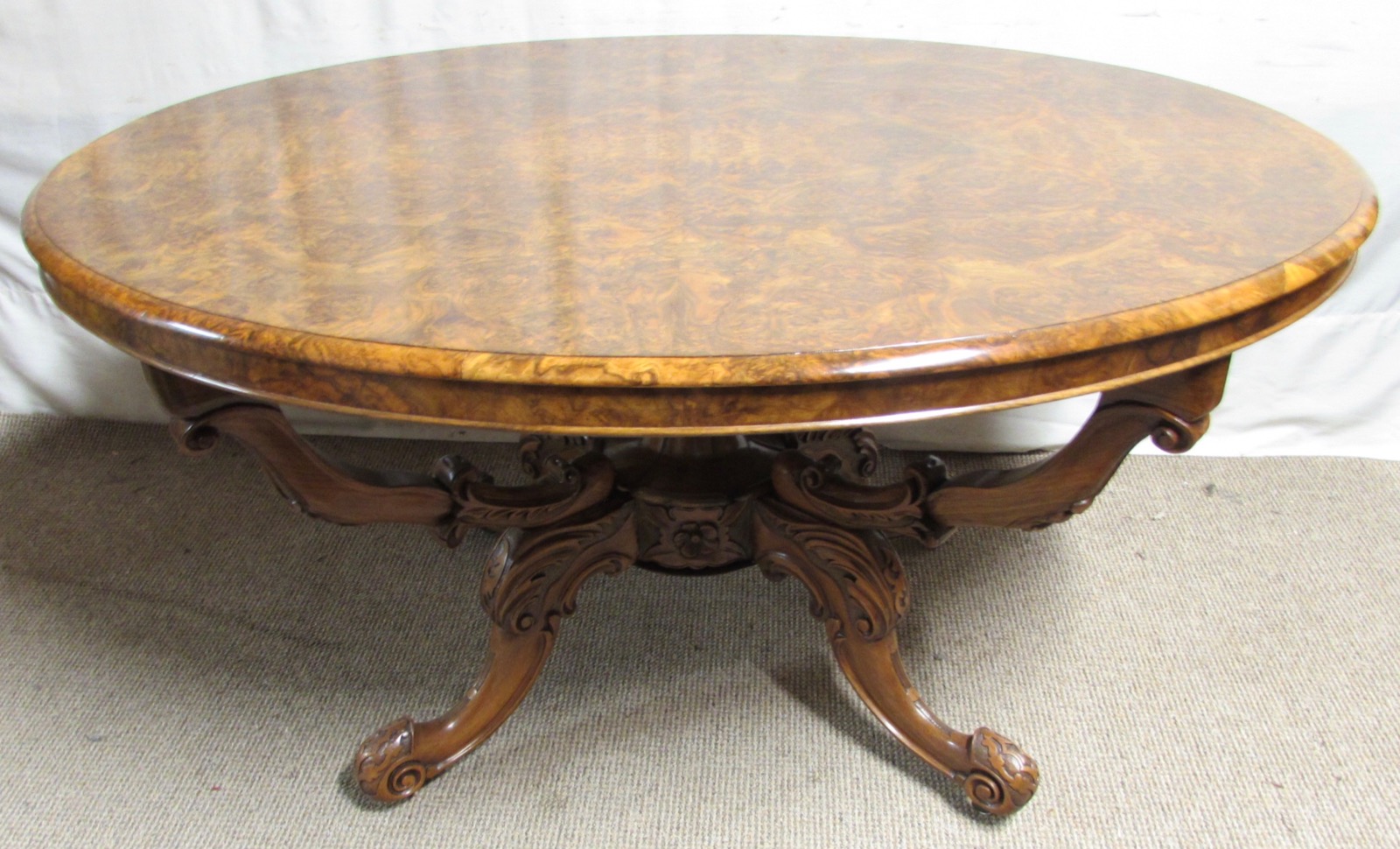 A superb quality Burr Walnut Victorian oval Loo dining Table or Centre Table. Made from Solid Walnut with the best Burr Walnut veneer to the top. The basket base is very carved and sturdy. This is the finest quality from the mid Victorian period and would grace any home.