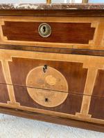 A superb French Louis XVI Commode Chest of Drawers. Having 3 drawers and the highly desirable variegated Rouge Marble Top. Lovely inlays to the front and brass capped feet. All the drawers run smoothly and key is present.