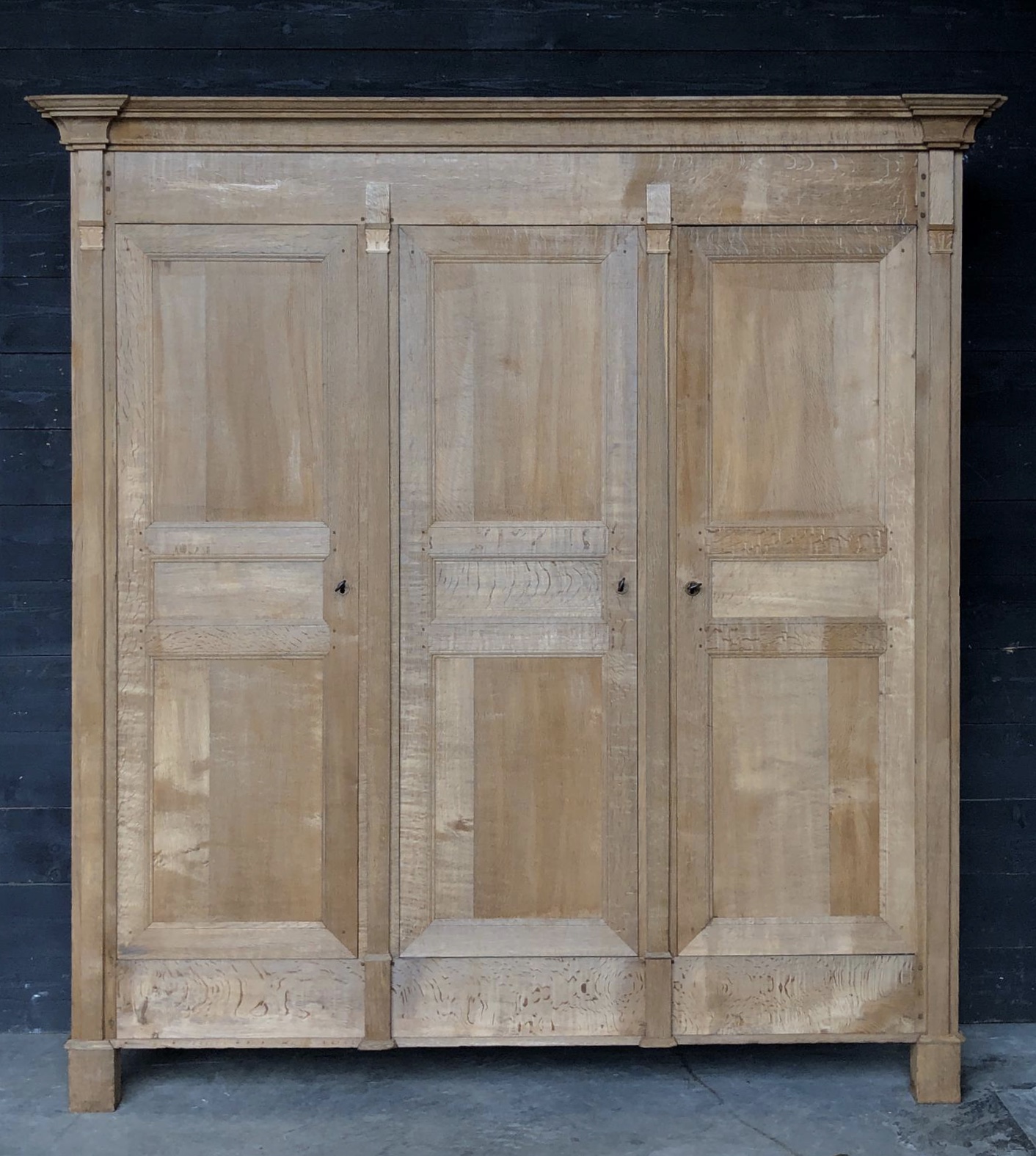 A wonderful and very rare French Directoire Armoire, an early example dating to around 1830 and made from solid Oak including the back and pegged together. All keys present for the 3 doors. We have bleached it for a fresh look but can be waxed to any colour or shade desired.