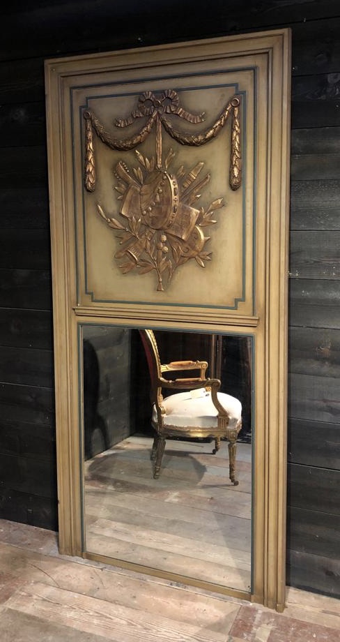A fabulous French Trumeau Mirror dating to the late Victorian era. Originally decorated with gilt decoration. The top panel has a delightful musical motif. Highly decorative and would grace any home.