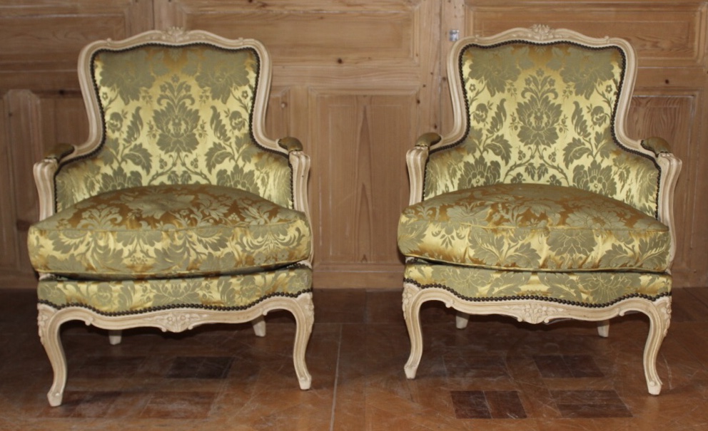 A truly superb pair of French chairs or bergeres as called in France. Original off white paint and fabulous floral upholstery. The chair frames are strong and sturdy and they are extremely comfortable.