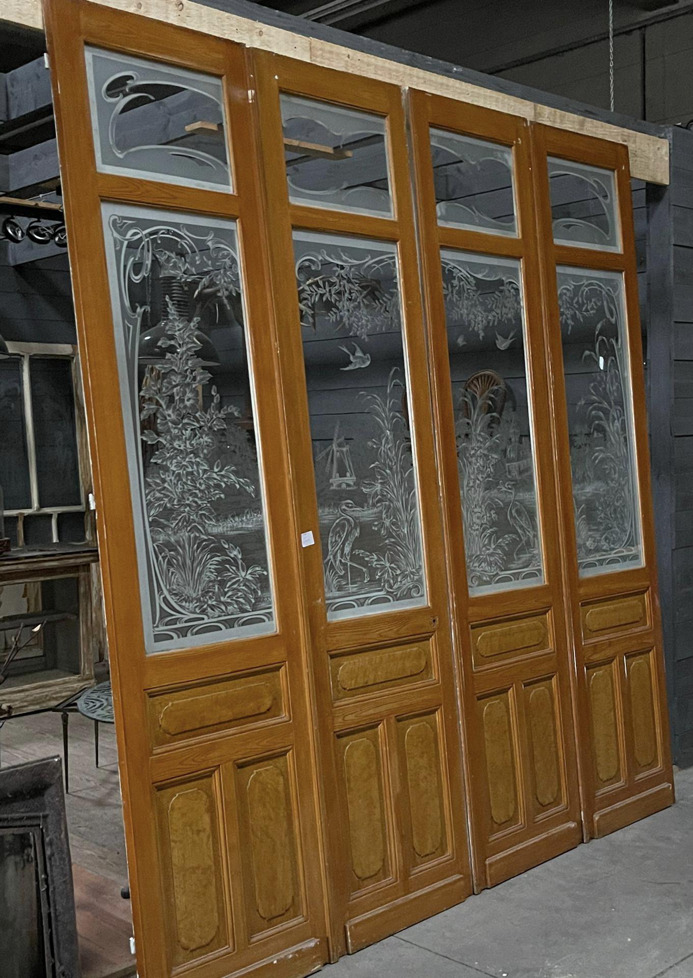 A stunning set of 4 French 19th Century Chateau Doors, rarely having 2 etched panels in each door. The glass is all prefect. I have seen these used as bi-fold doors, room dividers, patio doors etc and they always look amazing.